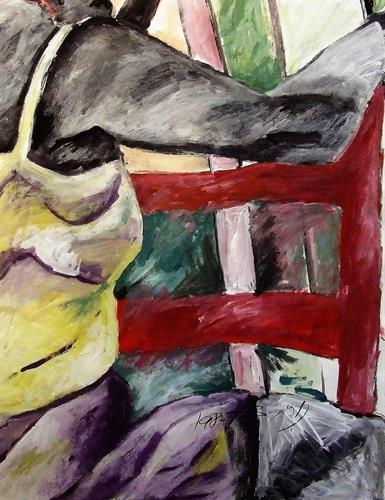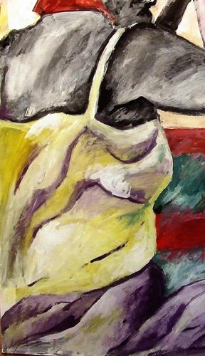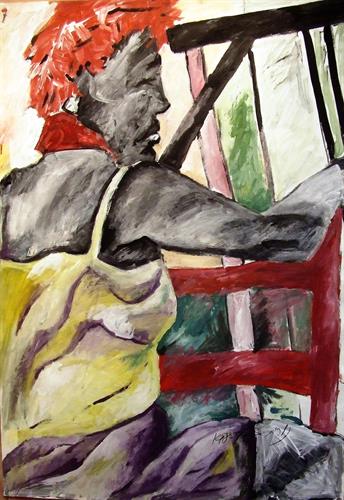 שם: אלמונית ביקרה בסטודיו, טכניקה: גואש על נייר עבה, מידה: 100X70, תאריך: 1985