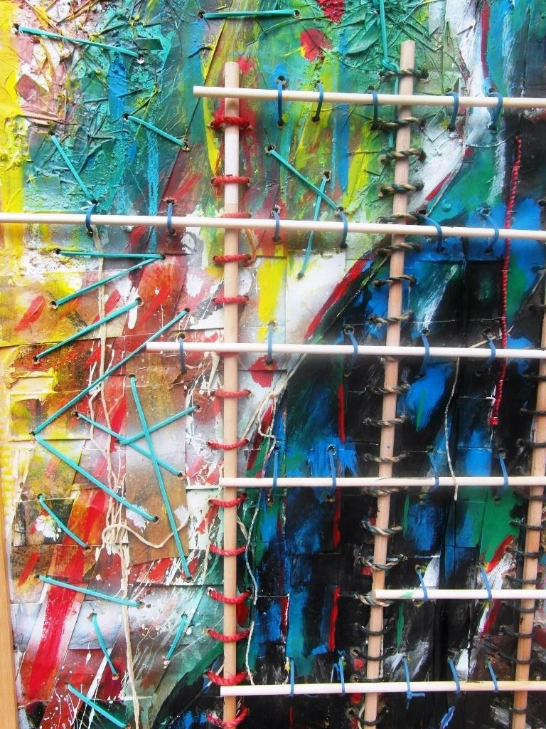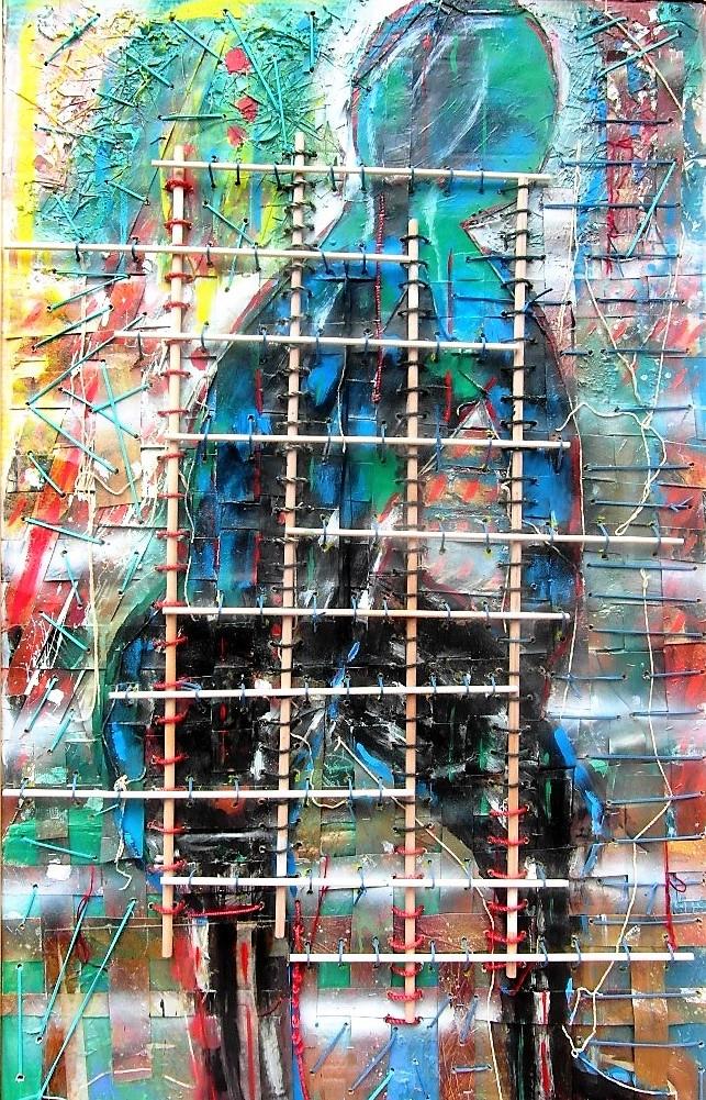 שם: הצל במשחק הסולמות, טכניקה מעורבת _ אקריליק על קרטון, וקולאז' שתי וערב, ושילוב חומרים, מידה: 140X120, תאריך: 2016