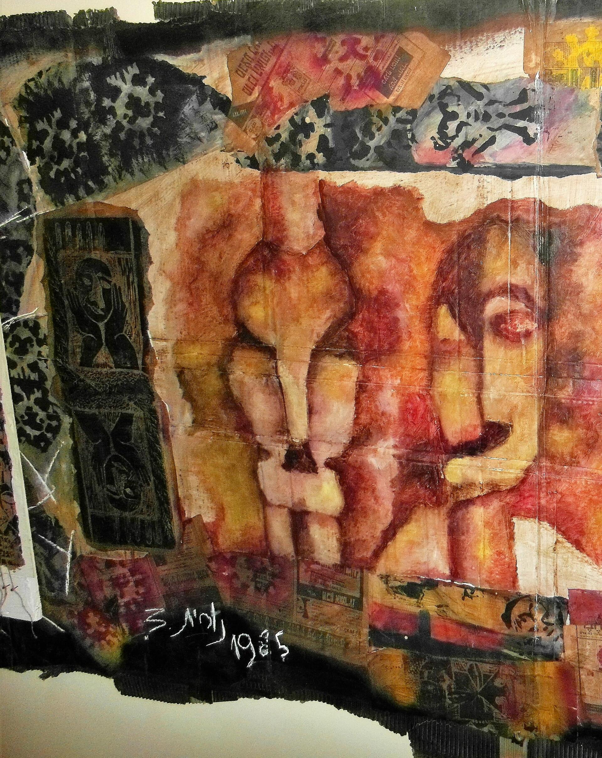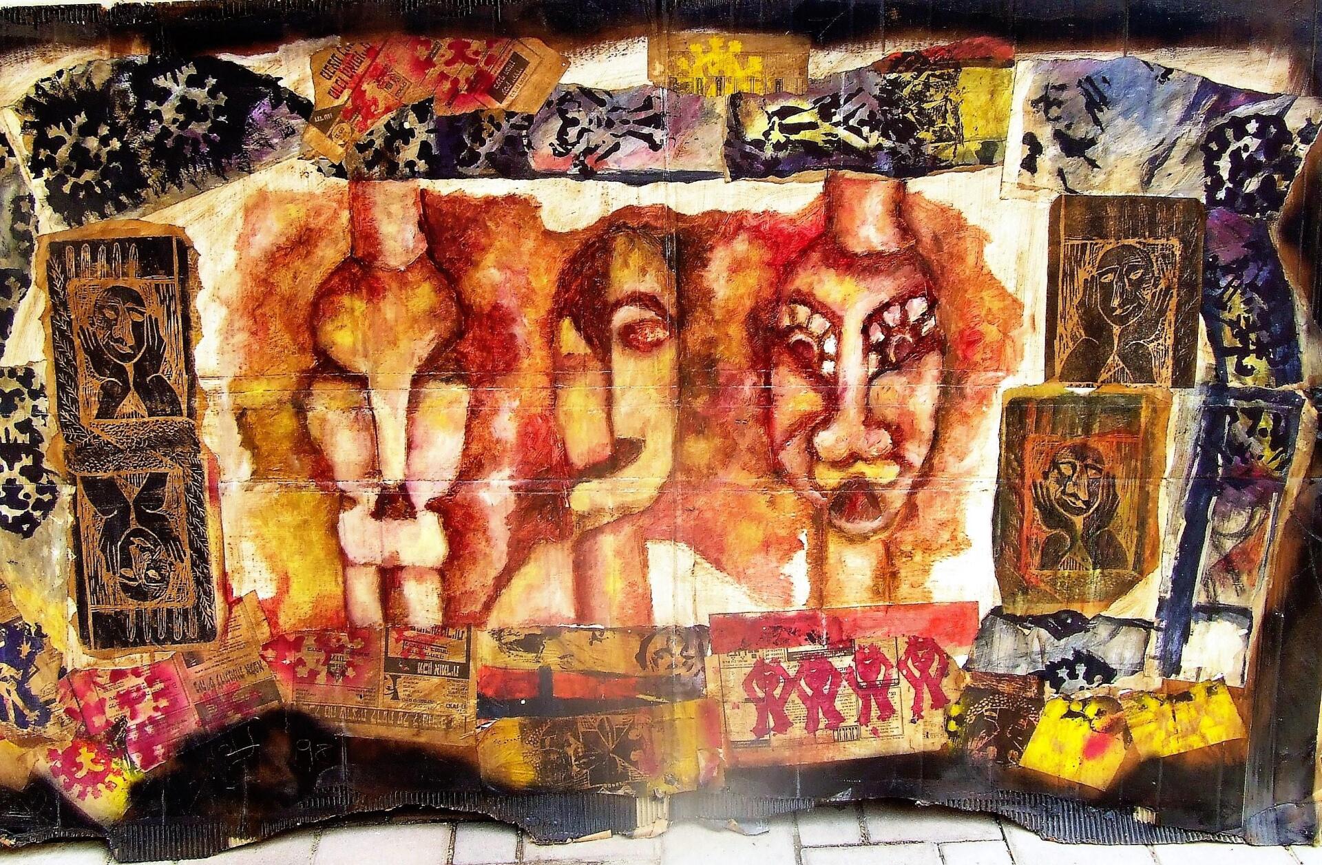 טכניקה מעורבת: שמן על קרטון גלי, וקולאז' הדפס חיתוך לינוליאום