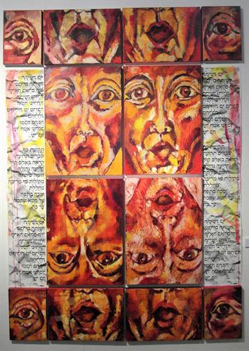טכניקה: אקריליק על בד ושילוב חומרים ( רקמה וכתב) - מיצב קיר